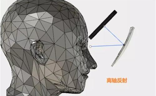 离轴反射的原理跟VR眼镜一样直观,显示屏的内容通过一个透明的反射镜面,反射到眼睛里,而外面的景物,也透过这个镜面进入眼睛,从而实现了虚实景物的叠加。