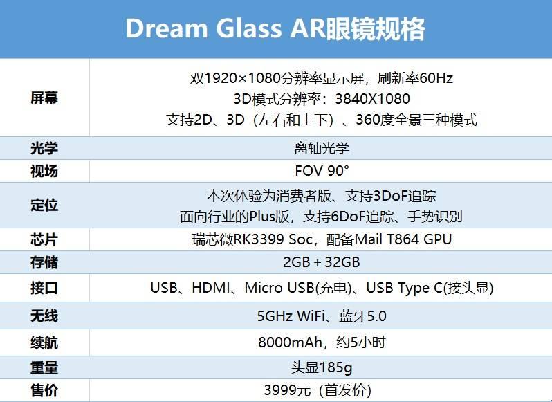 Dream Glass拥有着90度的大视场角,双1920×1080分辨率显示屏(双眼4K级别),刷新率60Hz,显示则支持在2D/3D/360度全景模式下切换,播放3D内容时分辨率可达到3840×1080。此外,面向行业端Plus版本则支持6DOF追踪,手势识别等功能。