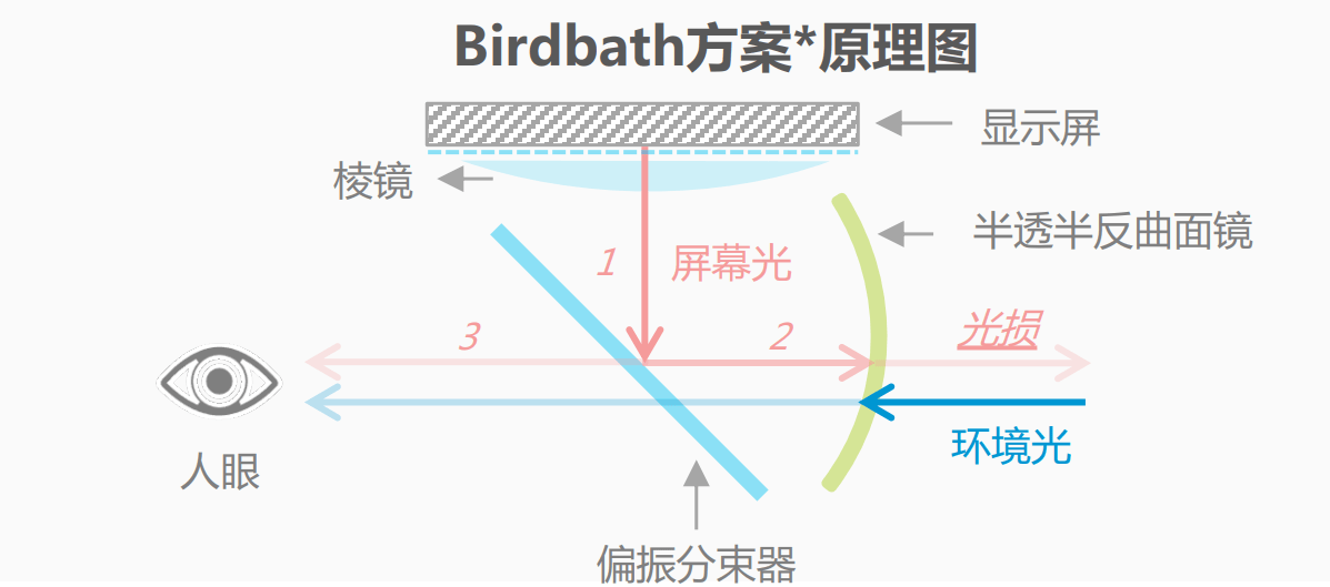 “Birdbath”是光学结构的通用名称,通俗的讲就是带有光束分离功能的曲面镜,垂直于曲面镜的光则通过分束器反射到曲面镜上。