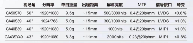 通过上图产品参数我们可以得知,惠牛产品FOV已经达到了50°,实现了大FOV以及更优的画面清晰度。模组重量区间在5g-9.5g之间 ,其中,单目最轻为5g,出瞳距离区间为11mm-15mm,画面畸变控制在小于0.6%-1.0%的极低水平,分辨率为1920*1080,屏幕亮度最高达到3000nit。