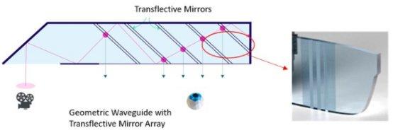 几何阵列光波导通过阵列反射镜堆叠实现图像的输出和动眼框的扩大,可以实现图像质量包括颜色和对比度可以达到较高水准,但是存在三个难点:一是耦入部分的体积难以缩小,二是光波导固有的明暗条纹问题,三是量产难度大。由于制造工艺繁琐,良率低,能大规模的量产眼镜产品较少。