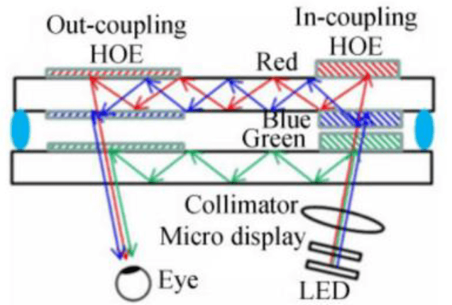 衍射光波导,简单讲就是基于光的衍射,引导光波传播的介质装置。进一步解释,衍射光波导就是利用光栅的衍射特性来设计“光路”,让光在设计好的路径上传播,将微投影系统发出的光导入人眼。