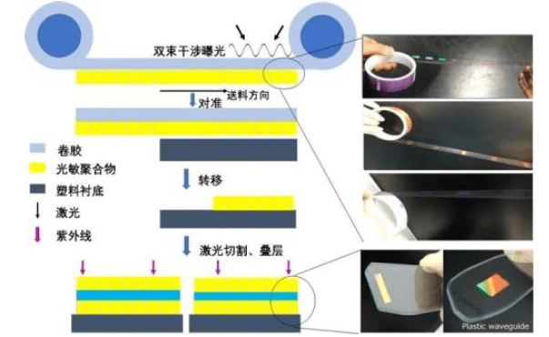 Digilens开发了体全息光波导的加工工艺流程。其中,为降低大规模批量生产的加工成本以及为进一步提高生产效率,Digilens开发了体全息光波导印刷工艺。