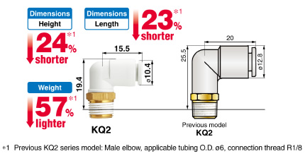 * Existing model KQ2 series Male elbow/Applicable tubing O.D.: ø6/Connection thread: R1/8